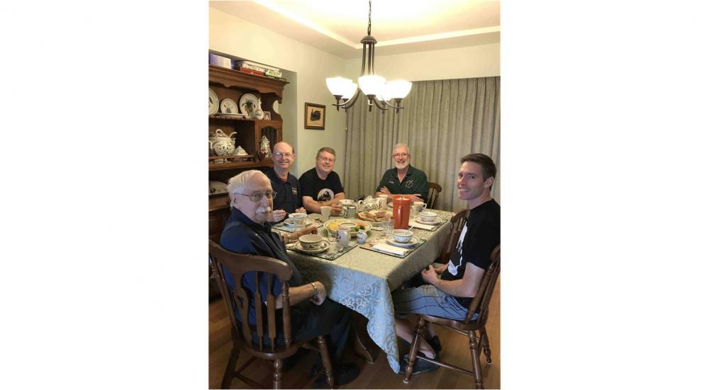Home Crew Lunch gathering & briefing. From L – R: Ken M, Brian D, Gordie M, John G. Mike N.